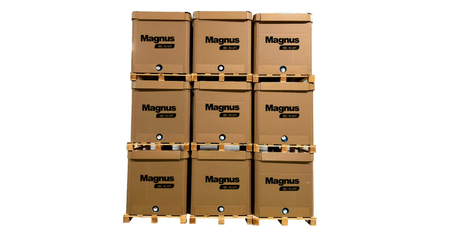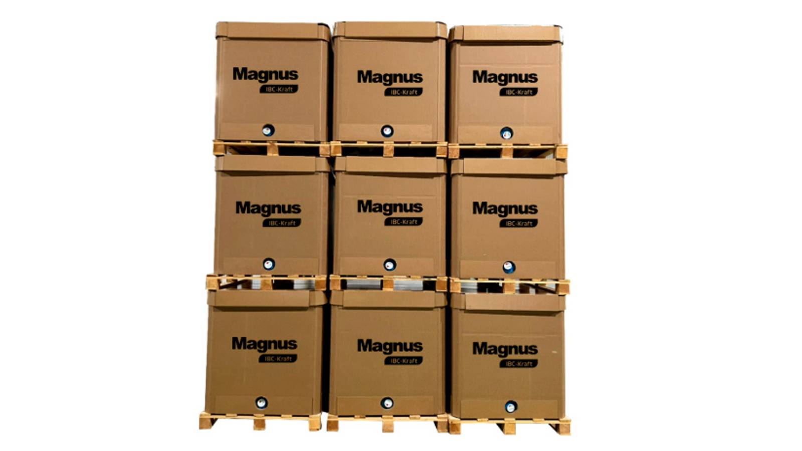 Magnus IBC-Kraft destaca por su gran resistencia gracias a la innovadora tecnología MAX. La cual ha logrado superponer hasta diez capas de cartón ondulado, estandarizar unos hendidos especiales de plegado y conseguir un formato de caja todavía más grande y resistente.