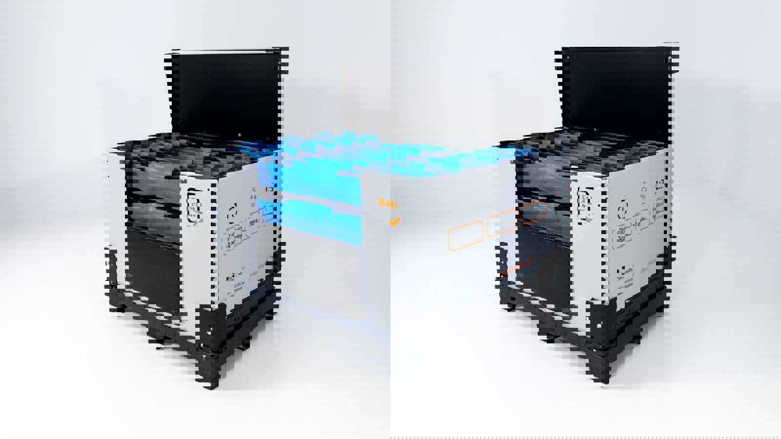 Gran contenedor de plástico o cartón ondulado. Plegable, ligero y reutilizable.