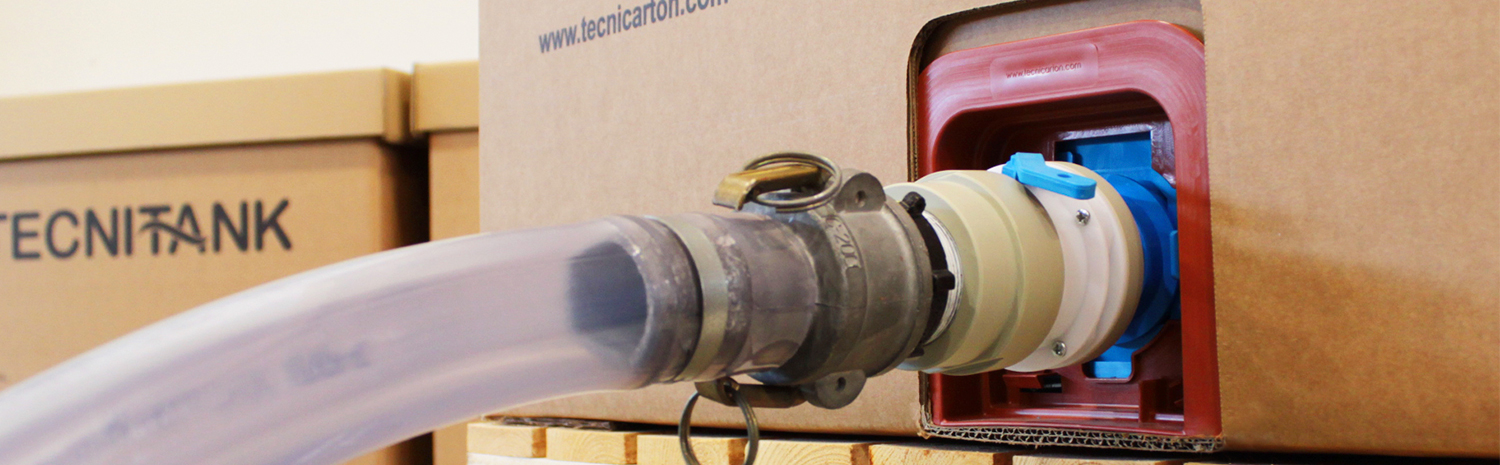 Embalaje realizado 100% en cartón ondulado de alta resistencia, para transporte y almacenamiento de 1.000 litros de líquido a granel, de manera segura y económica. Cuenta con una bolsa interior, que puede ser aséptica si se necesitase, para proteger su contenido, garantizando que el aire no modifique sus cualidades y se mantenga en perfecto estado.