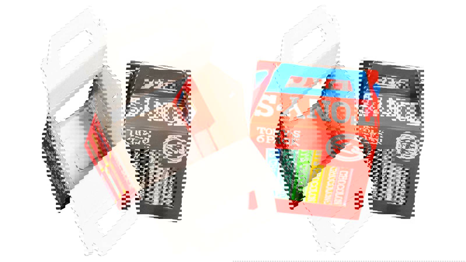 De creatieve retailverpakking van DS Smith biedt plaats aan zes repen van 180 g uit het regenboogassortiment van Tony's Chocolonely. De aantrekkelijke en duurzame verpakking met hoogwaardige offsetbedrukking en een praktische handgreep van golfkarton brengt de branding en de merkboodschap bij de consument thuis.