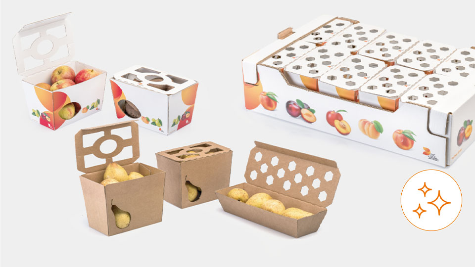 • Golfkartonnen punnets voor het direct verpakken van fruit en als goed recyclebaar alternatief voor eenmalige plastic supermarktverpakkingen.