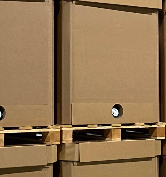 O contentor em cartão canelado com capacidade para 1000 litros e maior resistência para o transporte de granéis líquidos