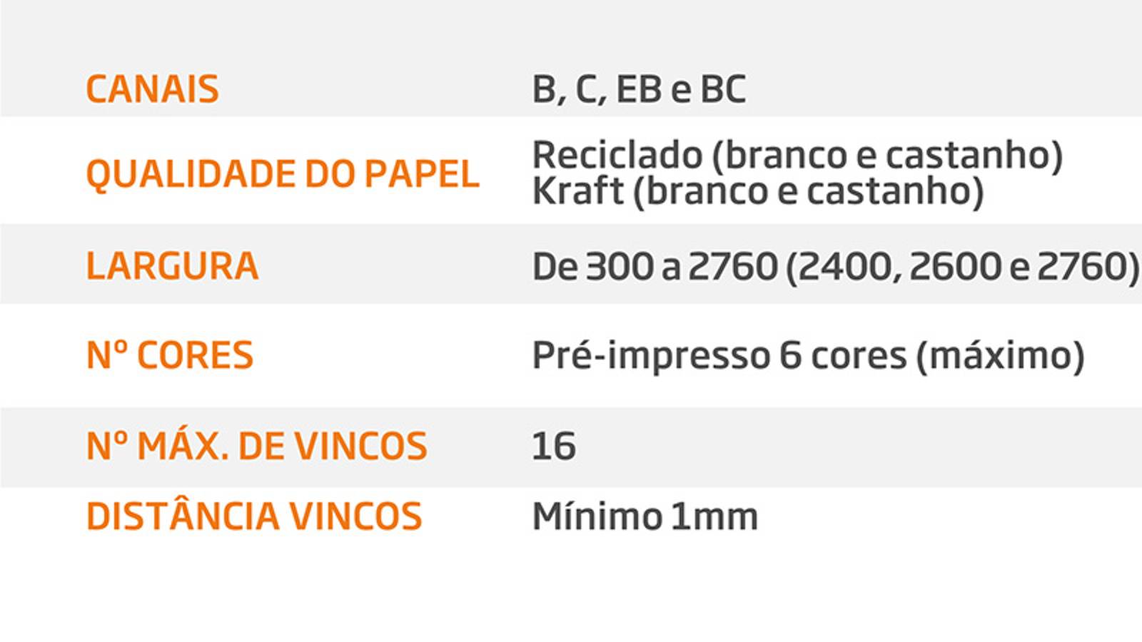 O cartão canelado Fanfold está disponível em diferentes tipos de canais para se adaptar a várias necessidades de resistência e proteção e em diferentes tipos de papel. É disponibilizado em larguras que variam entre 300 e 2760 mm, proporcionando flexibilidade nas soluções de embalagem.