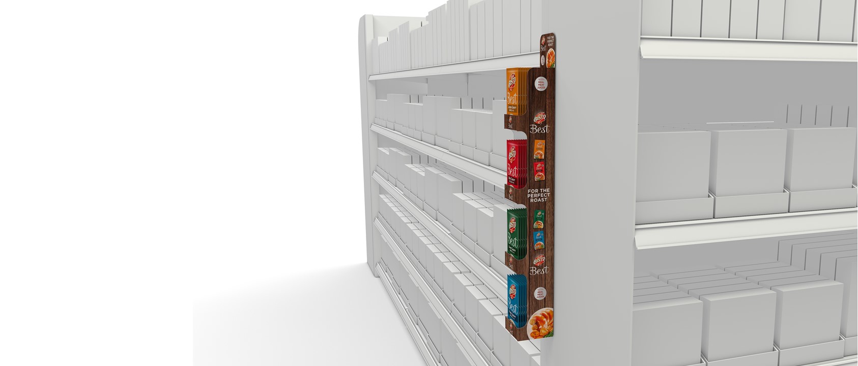 Plastic usage in retail is a primary concern for Premier Foods. If it gets misplaced or removed the material poses a recyclability challenge. Consequently, we were tasked to rethink the Bisto Gravy Sachet Clip Strip holder design and develop a more optimised solution for the supply chain which would ensure it was reusable at its end of life, and could be recycled through normal back of store waste streams.